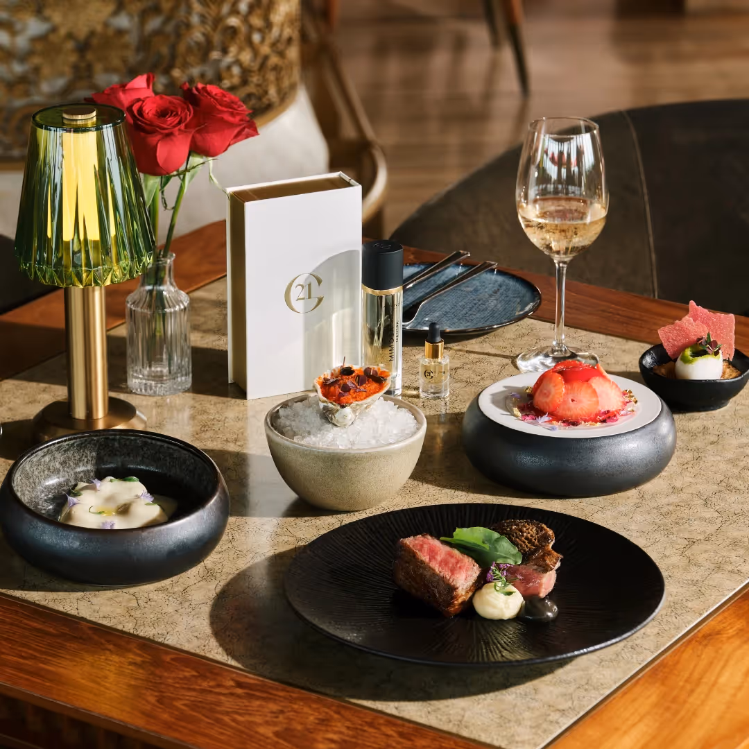 Celebrate with our 3-course set lunch for $168++(11:30 AM - 3 PM). Relish in refined signatures including King Crab with Scallop Mousse and the premium Miyazaki Striploin A4, crafted to make your celebration memorable as you overlook the city.Because every love story deserves a keepsake, enjoy a complimentary Maison 21G perfume worth S$150 when you dine with us for lunch.